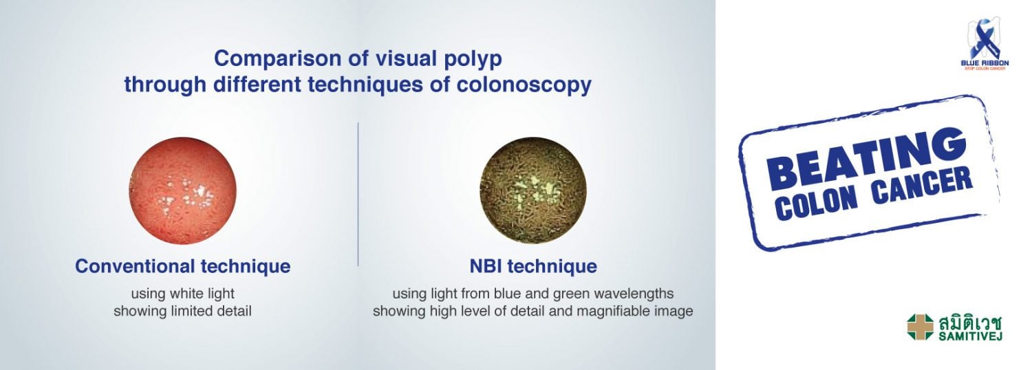 Subsequently, through a medical collaboration with Sano Hospital in Japan, Samitivej adopted Narrow-Band Imaging (NBI) International Colorectal Endoscopic classification (NICE) with magnification. This is the most validated classification system for the detection of colorectal polyps. NBI is an imaging technique that uses a light spectrum of blue and green wavelengths to stimulate hemoglobin (Hb) (an important molecule carried by our red blood cells). As the hemoglobin molecules absorb the blue and green wavelengths, nearby blood vessels will start to appear a dark brown in color. This allows us to see the epithelium and shape of the blood vessels more clearly due the contrast in color. NBI also enables us to magnify these images, so that the doctor can see the shape of the blood vessels in maximum detail. As a result he/she can immediately distinguish the depth of any invasion of cancer cells in the tissue.